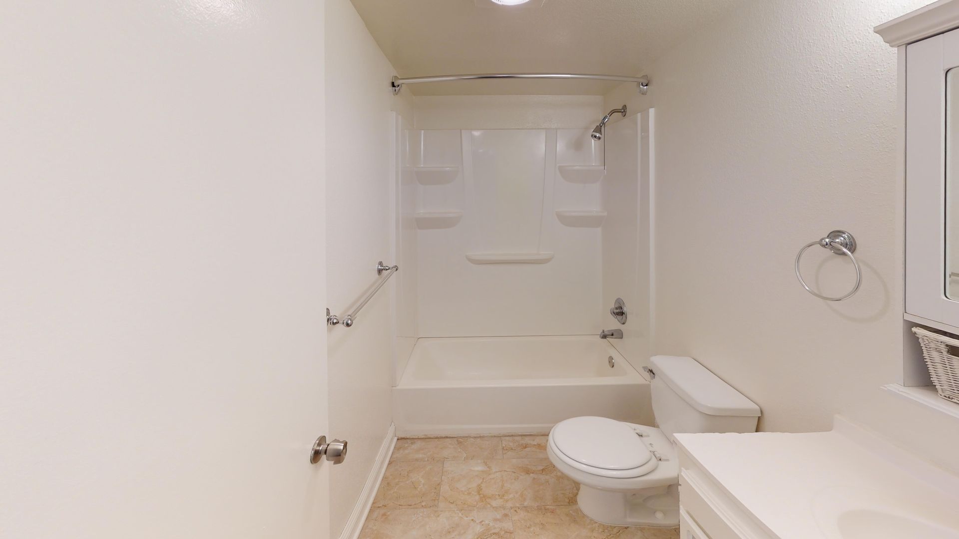Bathroom: vanity and shower enclosure newly re-tiled, new sink, new tub and new fixtures, new medicine cabinet, tile flooring. The rest of the unit: engineered wood flooring, new crown molding, new ceiling fan, new blinds and freshly painted. Large balcony, central air and heat, lots of closet and cabinet space.